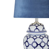 This is the Acanthus Blue and White Ceramic Lamp With Blue Velvet Shade. A handcrafted ceramic lamp, in traditional ginger jar shaped design. This lamp's eye-catching pattern in a classic blue and white cololur combination stand the test of time. Arriving complete with ball-topped blue velvet, this lamp can be used to give any room an instant lift.