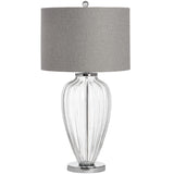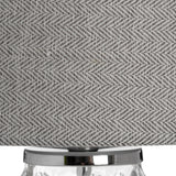 Blending modern and traditional aesthetics seamlessly, this eye-catching shaped table lamp features unmissable details such as fluted curved glass, a grey herringbone shade and hand carved glass finial; the small details combine to create its understated luxurious appearance. E27 Screw Bulb required.