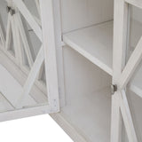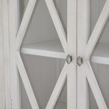 This is the Stamford Plank Collection Four Door Sideboard. The Stamford range’s sideboard is the perfect piece for spaces with a relaxed aesthetic. It will instantly lighten the feel of a room with its airy, lattice patterned, tempered glass doors. Pared back, timeless and with a weathered familarity, items from this range will feel like they've always been there the moment they arrive. Deliberately distressed, this handmade, planked pine sideboard has an inviting lived-in look, coupled with a calming colour-way. Use its internal shelving for styling and storage.
