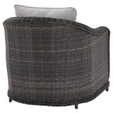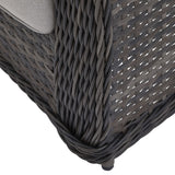 The sofa and armchairs come with comfortable seat cushions in a grade 5 Olefin fabric that keep their colour. The cushions are shower-resistant, UV-resistant and easy to remove. Because Olefins are more resistant to mildew than polyester and dry more quickly, they are an excellent choice for furniture exposed to the elements. Ideally cover them when not in extended periods of use and bring them inside during winter months for increased longevity.