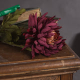A single stem spider chrysanthemum flower comprising a single flower head with a rust centre with an ombre effect to a mangostene coloured exterior.
