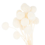 This is the Dried White Billy Ball Bunch Of 20. Billy Balls, also known as Craspedia are globe like blooms atop a thin stem which have an architectural beauty to them. Our dried stems in a crisp white colour look fantastic alone in a slim necked vase or interspersed amongst pampas grass for a 'fuller' looking arrangement. This bunch of 20 stems is perfect for those looking to add additional texture to their living space.