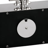 A nickel finish, rectangular clock in the shape a pocket watch.