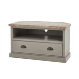 The Oxley Collection TV Unit boasts a useful drawer and shelf, circular hole to manage unsightly wires and corner-friendly shape. Its features are all designed to help keep its washed wood surface clutter free and provide the space required for modern home entertainment essentials. Stylish as well as functional, this side table would be equally at home centre stage in a room as tucked into a corner.
