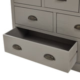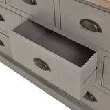 The Oxley Collection Nine Drawer Chest is perfect for display as well as storage. A washed wood plank surface blended with a frame in a warm grey hue deliver a relaxed, informal feel to any space. Stylish as well as functional, this high quality item would be equally at home in traditional and contemporary styled spaces. Style with a couple of lamps to really highlight its beauty.